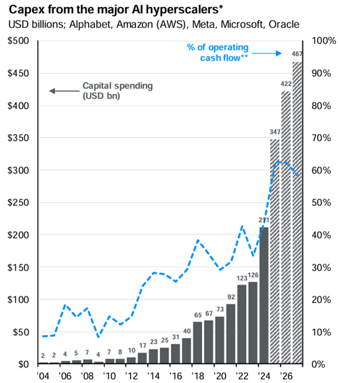 Artificial intelligence remains the defining growth theme. Analysts expect capital expenditures from leading AI hyperscalers (Alphabet, Amazon, Meta, Microsoft, Oracle) to surge from $126 billion in 2023 to over $400 billion this year. These firms have ample balance-sheet resources to fund the build-out, fueling demand for suppliers like NVIDIA and Broadcom. Investors broadly recognize that AI is ushering in a new technological era, reshaping information processing and task automation, with the potential to unlock major productivity and growth gains.